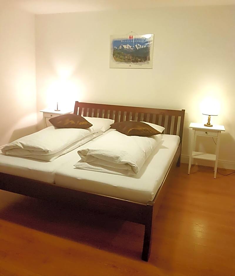 This room is located on the first floor and is accessible via stairs. It comes with 2 single beds, a kitchenette and a bar table. It also features a private balcony offering stunning views of the Jungfrau and Lake Thun. The private bathroom is fitted with a shower.