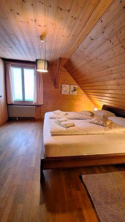 Located on the third floor, this split-level maisonette consists of a bedroom with 3 single beds on the upper level and a living room, a kitchenette and a dining area on the lower level. The unit is fitted with large roof windows, which offer views of the Alps and the Thunersee Lake. It contains 1 bathroom with shower.